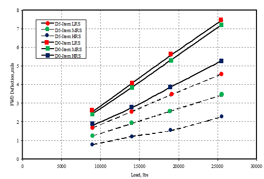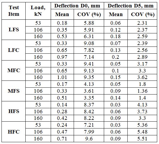 The table below summarizes the FWD test results for the rigid pavement test items at the center of slabs (deflection basin tests). An analysis was performed on the D0 and D5 measurements at the center of the slabs for test items LRS, MRS, and HRS. D0 is an indicator of the overall stiffness of the pavement structure and D5 is an indicator of subgrade stiffness. They concluded that within each test item, the layer stiffness was uniform.