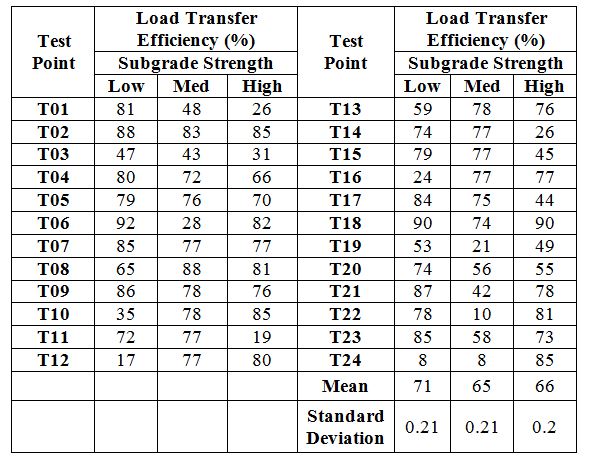 The tables below show the calculated Joint load transfer efficiency (LTEδ), values for longitudinal and transverse joints, based on the 24 kip drops.