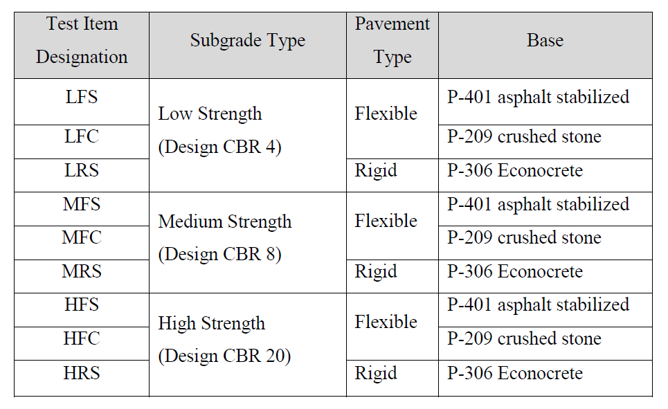 Within the three sections were nine test items; six flexible and three rigid. The flexible test items were either stabilized (asphalt on P-401 asphalt stabilized base) or conventional (asphalt on P-209 crushed aggregate base). The rigid pavement test items were constructed on P-306 Econocrete base. The table below lists the test item designations. The specifications for the materials used were based on the FAA advisory circular AC 150/5370-10A.