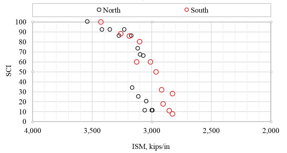 To understand the correlation between the overlay deterioration and overall pavement stiffness, average ISM values are plotted against SCI, in the figure below, for both the north and south test item. Below the threshold SCI value (60), the ISM values on the North side shifted up before continuing the decreasing trend. The increased stiffness of the asphalt interlayer at low temperatures possibly contributed to an increase of the overall pavement stiffness which leads to a drop in the measured deflections.