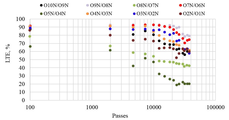 - The joint deterioration was evaluated in terms of LTE. A good correlation was observed between LTE and SCI. Considering both the north and south test item, an LTE ranging between 55% and 65% was attained when the SCI dropped to about 10.