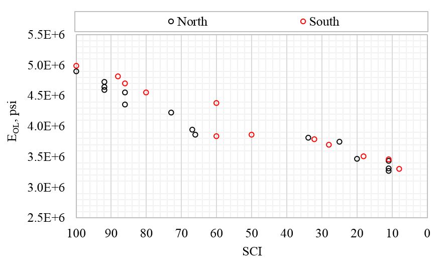 Layer moduli were backcalculated using the HWD deflection basin collected from the center of the slabs. In general, the layer moduli degraded. The rate of modulus degradation was high in the PCC overlay and underlay compared to that in unbound materials. The layer moduli on the north test item were slightly higher than those on the south test item. The unbound layers (i.e., subbase and subgrade) also degraded with slight difference in trends. The figure below shows the change in average PCC overlay modulus with change in SCI for both north and south test item. For both test items, the modulus degraded with decreasing SCI.