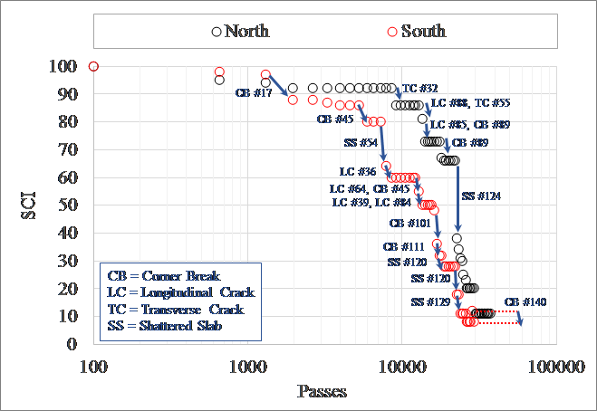 The initial goal for the traffic test was to achieve a single digit SCI on both the north and south test items. The traffic test started on October 10, 2017. The traffic test was terminated in the south test item on January 11, 2018 after a total of 29,370 vehicle passes were completed and a SCI value of 8 was attained. Traffic continued in the north test item until a SCI value of 11 was achieved on February 1, 2017 after a total of 37,290 vehicle passes were applied.