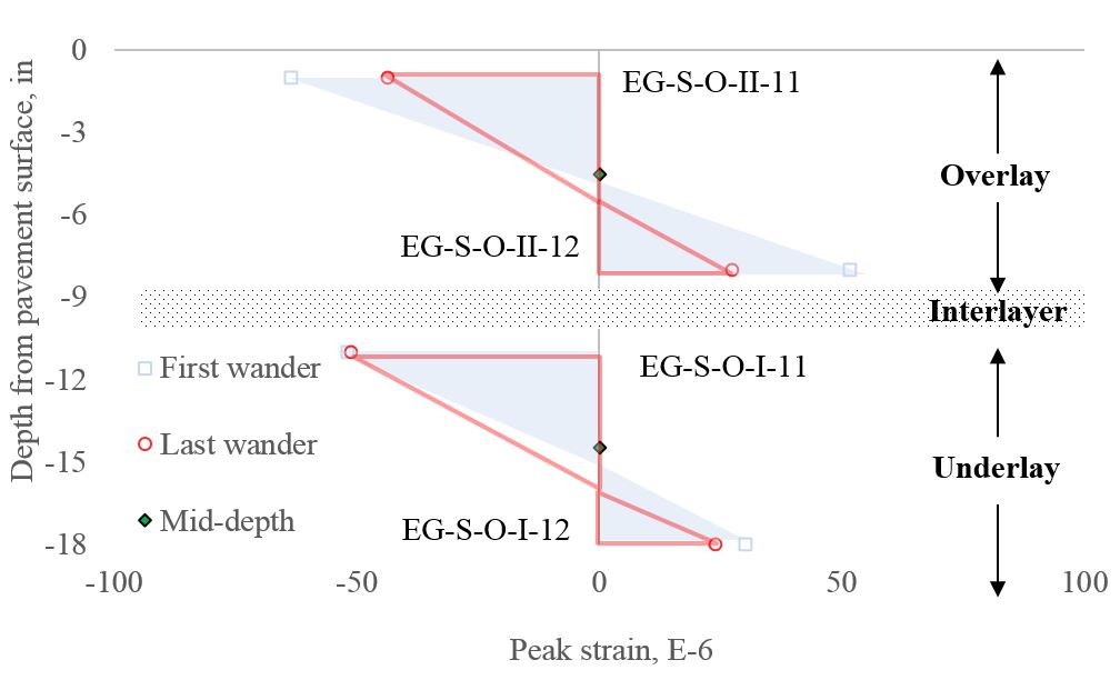 The possibility of neutral axis shifting was evaluated. The neutral axis position NAP relative to the bottom of the slab was computed based on both the compressive and tensile strains, and their distance from the neutral axis. In general, the initial overlay NAP (first wander) was observed to be slightly below the mid-depth, suggesting a possible bonded condition between the asphalt interlayer and overlay. As expected for unbonded PCC overlays, a strain reversal was observed at the interface above and beneath the interlayer. The effect of traffic induced damage in the overlay was reflected not only by the NAP downward shifting but also by the reduction in strain response (last wander) captured by both top and bottom EGs.