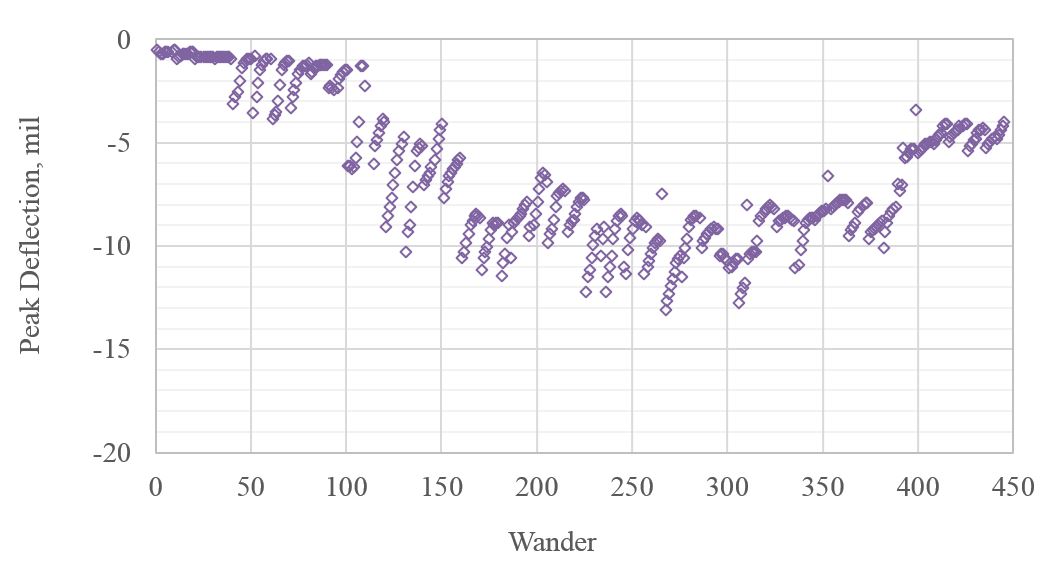 The figures below illustrate the change in the maximum deflection response of ECS-S-O-II-1 and the occurrence of the corner breaks that took place within the same time frame. Past wander 100, an increase in the rate of change in maximum deflection was observed. Between wander 255 and 265, the maximum deflection began to level off.