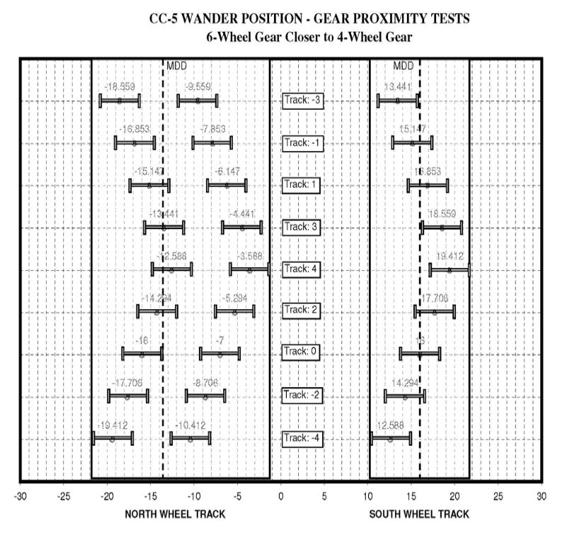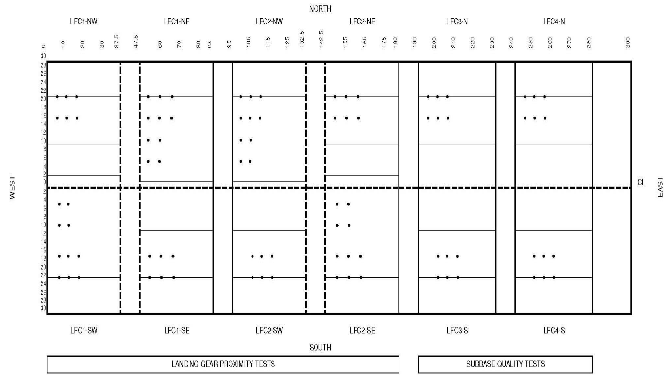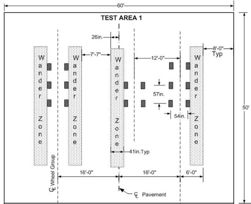 Two landing gear configurations were used for trafficking the test items; a 6-wheel landing gear and a 10-wheel landing gear. Figure below presents Test Area 1. A pavement centerline that divides the test items into north and south sections is shown. The Figure presents the wheels configurations of sections loaded with 10- and 6-wheel gears on different sides. The Figure also depicts wander zones for each group of wheels. The wander zone of the 10-wheel gear extends on both sides of the centerline in Test Area 1 configuration. In Test Area 2 configuration, however, the 10-wheel gear is contained on one side of the pavement centerline and wander zone stops 10 inches from the centerline as shown.