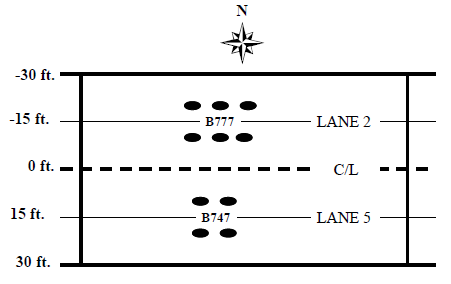 HWD tests were conducted on all flexible test items to monitor the pavement structural degradation with traffic and time. These tests were performed on the non-trafficked centerline (C/L), 6-wheel traffic (north) lane, and 4-wheel (south) traffic lane at 10 ft. (3.05 m) offsets, as illustrated in the figure below.