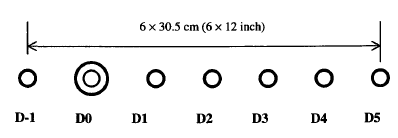 The main objectives of conducting HWD tests were to verify the uniformity of the pavement construction, particularly subgrade strength; investigate the pavement deterioration with traffic and to determine the joint load transfer efficiencies. For CC1 tests on rigid test items, one sensor was positioned at the center of the load plate (D0), and another sensor was positioned 12 inches in front of the plate along the path of the vehicle (D-1). This allows the HWD unit to be positioned such that the D-1 sensor is on the opposite side of a joint from the load plate to evaluate the load transfer efficiency. The remaining five sensors were positioned behind the plate at 12 inch (305 mm) spacing.