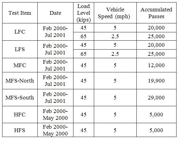 The test item, dates, wheel loads, and loading passing for each stage of trafficking are summarized in the table below. Trafficking was performed at 5 mph (8 km/h). Wheel loads were set at 45,000 lbs. (20.4 tonnes) with a target tire pressure of 188 psi (1296 kPa).