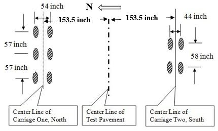 For the CC1 Experiment test items were loaded simultaneously with two gear configurations; a 6-wheel gear in one lane and a 4-wheel gear in the other lane as illustrated in the figure below.