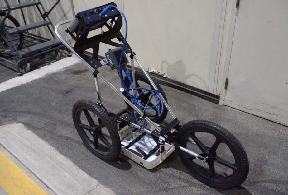 Ground Penetrating Radar (GPR) uses antennas that direct electromagnetic waves into the structure and receivers that record the reflected signals. Various antennas can be mounted on a vehicle or on a push cart, as shown. On CC8, a cart-type GPR device was used to investigate layer thickness, thickness change, and the pavement support structure. More information can be found on the GPR page.