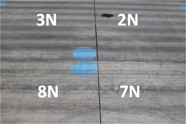 On February 22, 2016, an initial set of 66 passes of a dual (D) gear configuration with a 20,000 pounds per wheel design load was used to complete one wander pattern on the test pavement. Following this initial wander pattern, five overload wander patterns (330 passes total) of incrementally increasing dual tandem (2D) gear loads were applied. No cracks were observed, either visibly on the surface, or by evidence of strain gage responses. It was then decided to increase the wheel load. The revised overload test was executed on February 25 and 26, 2016. A per-wheel load of 28,000 pounds was used for normal traffic, and followed by revised overloads.