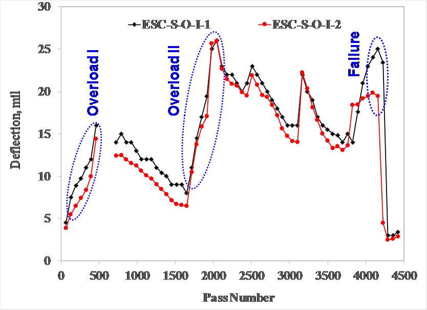 Deflections at the highest HWD load levels (12,000 lbs.) illustrated that the pressure exerted by the wheel loads distributed to the subbase and subgrade was relatively low and mostly carried by the concrete slabs. In addition deflections increased as the traffic testing. Based on the south test item, the traffic induced deterioration primarily occurred at the shallow depth for the south test items. As for the north test items, some damage accumulated in deeper layers during trafficking.