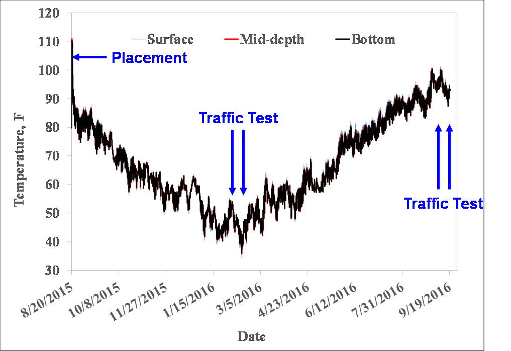 Concrete temperatures were monitored by the thermocouples installed at three depths in the P-501 layer: bottom, middle, and surface. As shown in the figure below, the highest concrete temperature was recorded about 20 hours after pouring, 111oF. Afterwards, the slab temperature started to drop due to the reduction of the heat from hydration. Assuming a linear interpolation between the bottom and surface temperatures, the maximum thermal gradient of 0.28oF/in was recorded at 14:00, 03/01/2016.
