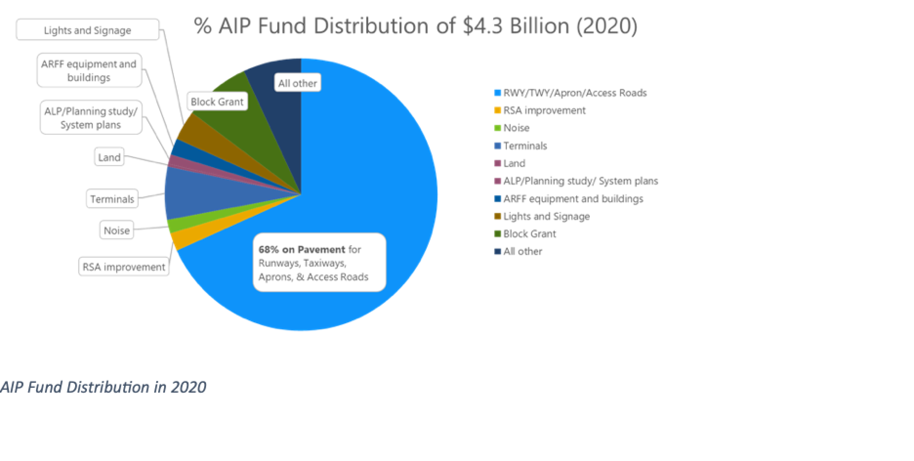 The Airport Improvement Program (AIP) allocates grants each year, about 68 percent of which are for airfield pavement projects. In other terms, over $2.9 billion of the $4.3 billion awarded to sponsor airports in Fiscal Year 2020 funded pavement projects (designing, building, and rehabilitating airport runways, taxiways, and aprons). Through active airfield pavement research, FAA will continue providing the guidance required to ensure that pavements last longer, withstand ever-increasing stresses, and require less rehabilitation over time. These findings will reduce pavements costs in the AIP, allowing the allocation of those funds to meet broader airport needs.