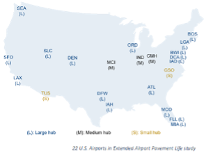 The extension of airport pavement life encompasses all airport pavement research and development areas (design, materials, and evaluation), as well as various airport safety areas. Since 2011, the FAA has collected data related to extending airport pavement life from 28 runways at 22 U. S. airports. These data include 17 of the 30 airports designated large hubs in 2017, as well as three medium-hub and two small-hub airports.