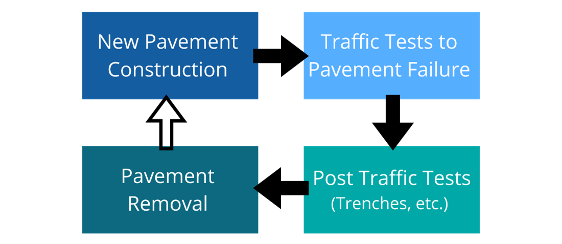 The timeline for a construction cycle is 2-3 years and includes the construction of the test pavement, installation of embedded pavement sensors, traffic testing to failure, post-traffic testing (trenching activities and other tests), and pavement removal.