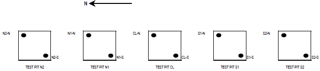 The P-154 subbase was then excavated using a backhoe. After testing on the subgrade surface was completed, test pits were dug and testing was performed at 6-inch (15 cm) depth intervals. The DCP tests were performed on the surface of the subgrade and at 24 inches (610 mm) below the surface of the subgrade. The test locations within the test pits in the subgrade are shown below. Thin-walled Shelby tube samples (ASTM D 1587-94) were stored and used for resilient modulus testing.