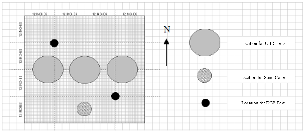 After finishing the testing on the base layer, test pits were excavated at the same location from the P-209 base to expose the surface of the P-154 subbase. CBR, sand cone and DCP tests were conducted on locations inside the test pits as shown in the figure below.