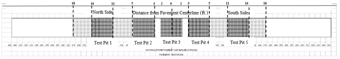 To conduct characterization tests, test pits were excavated at various locations along CC1. The surface area for each of the 6 trenches was divided into five areas as seen in the figure below. Five test pits with an area of approximately 4 ft. by 4 ft. were excavated in each layer of the trafficked and centerline areas (one in each trafficked area (area 2 and 4), one on the pavement centerline and two outside the wander path (area 3)). Characterization tests such as CBR, dynamic cone penetration (DCP), and in-situ density were conducted on top of each exposed layer.