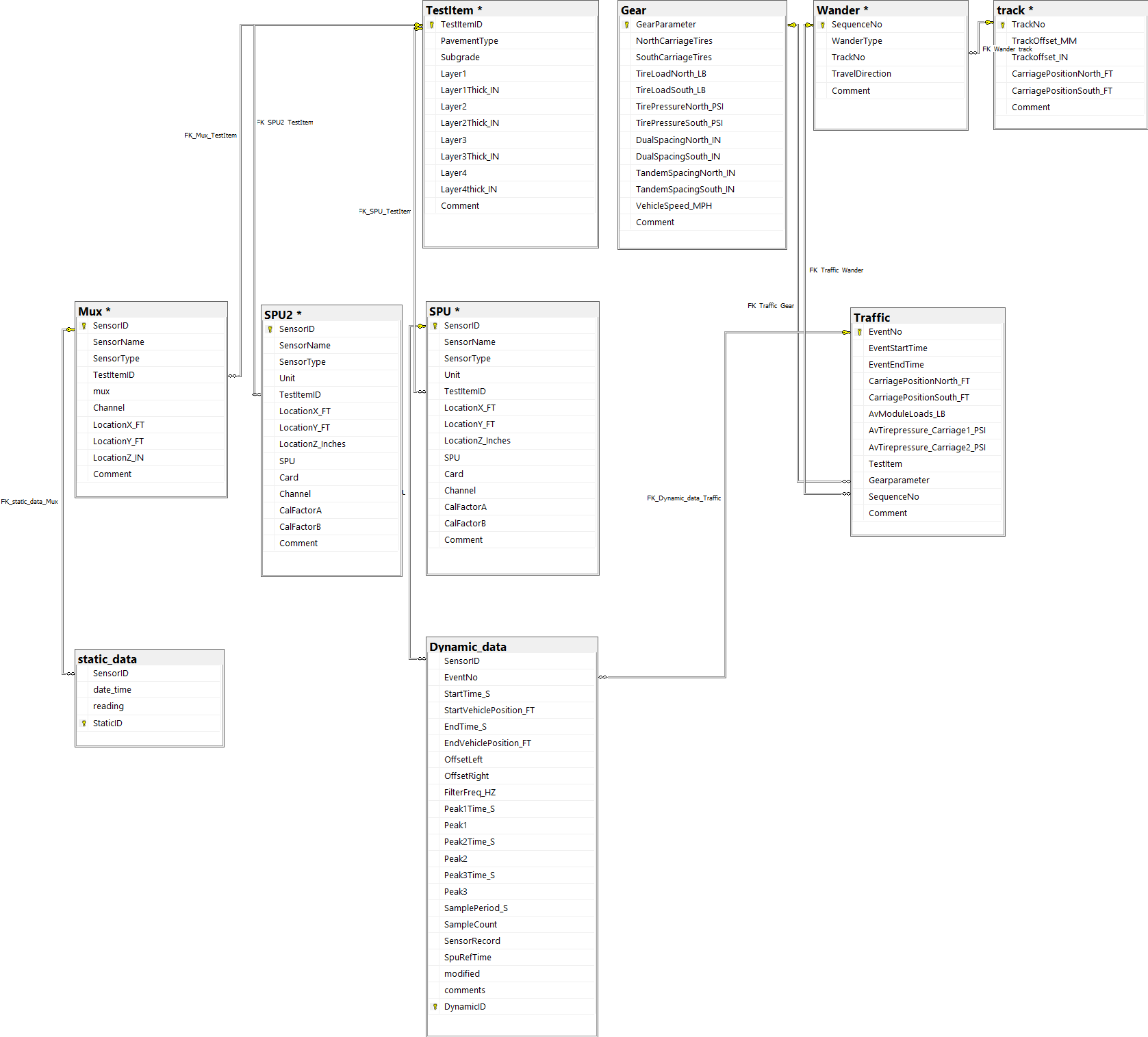 - Traffic - Contains information about the vehicle passes, including start and end times for each load event, gear configuration, applied loads (actual), and wander position.