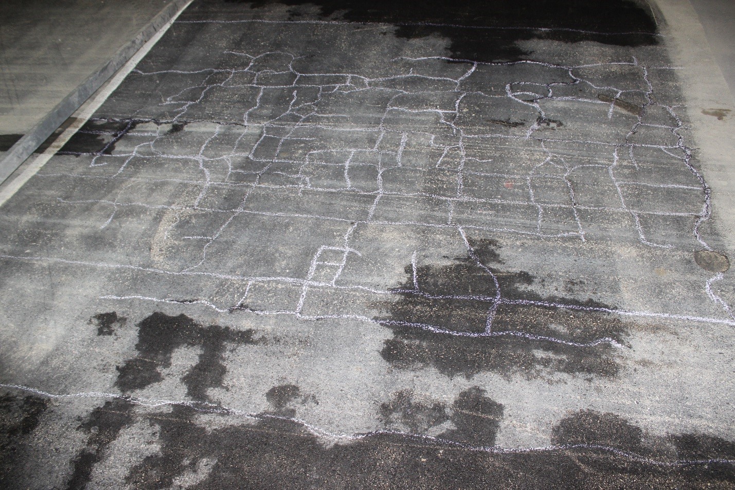 The distress surveys were performed on a daily basis in accordance to ASTM D5340. Visual inspections occurred daily after all trafficking had finished. The surveys were augmented with chalk markings, flashlights and other tools to ascertain the presence and pattern of very fine cracks. Cumulative plots of crack mapping were prepared. On these plots, the distresses were color-coded to separate dates/passes of distress surveys on which the new distresses were observed. The observed cracks were then processed and analyzed as follows: linear cracks for each test item were measured and cumulatively added; and fatigue areas for each test item were measured and cumulatively added. SCI calculations for each test item was generated for each distress survey.