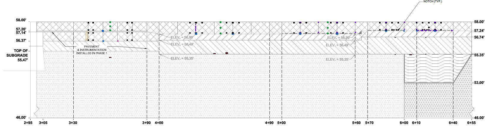 Instrumentation was placed in the P-152M subgrade, P-154M subbase, and P-501MR Portland Cement Concrete (PCC) surface layers. Moisture sensors (placed in the P-152M and P-154M layers) and pressure cells (placed in the P-152M layer) were the only sensors placed in the subgrade and subbase layers. Instrumentation within P-501MR was selected and installed to monitor vertical movement of the test slabs and measure strain responses at the top and bottom of the slab. The gauge selection was based on reliability, accuracy, and ease of handling at the construction site. The types and quantity of each gauge in addition to the sections they were placed in are presented in the table below.