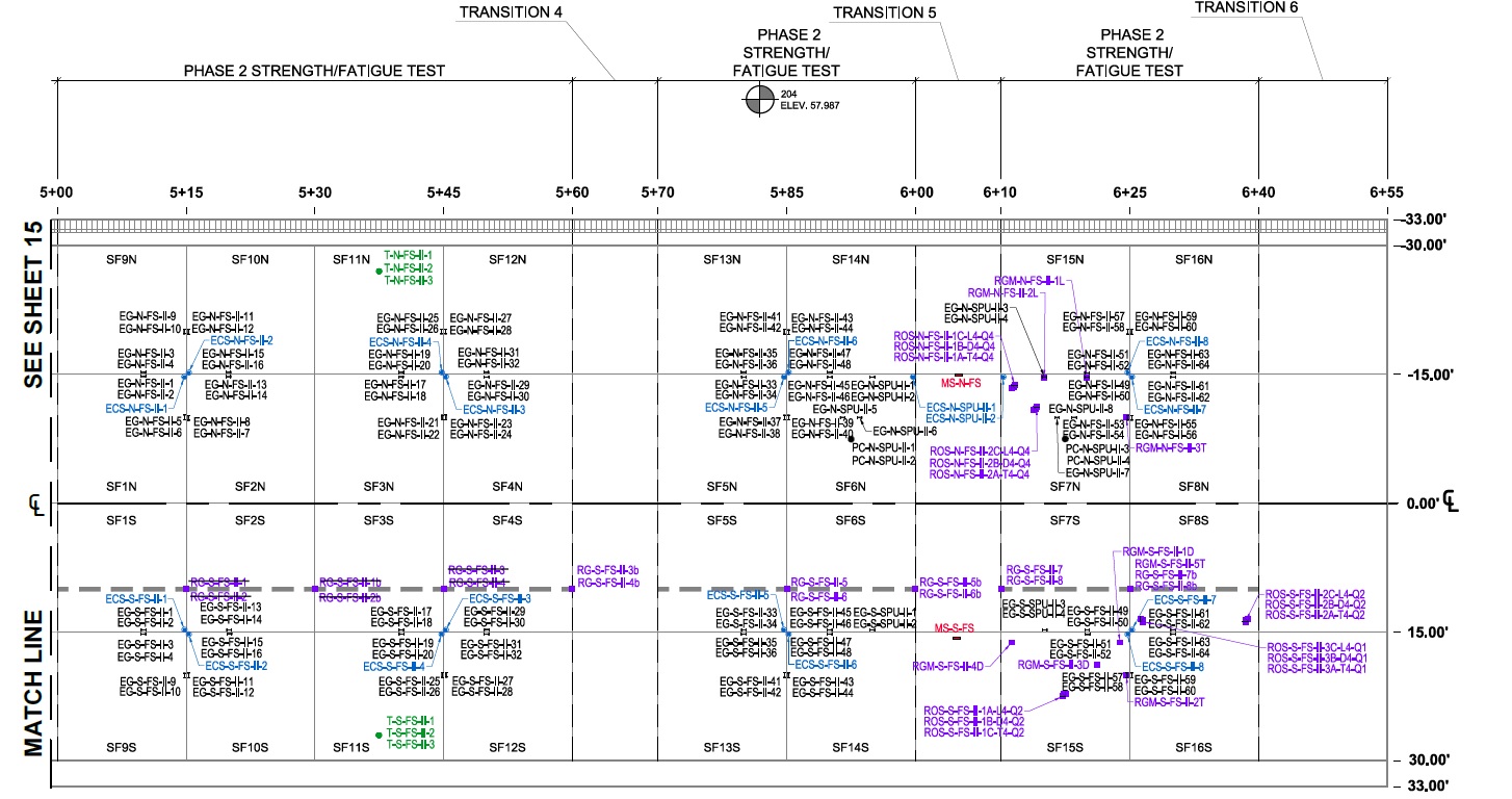 The images below displays the instrumentation plan for both Phase 1 and Phase 2. Sensors denoted with a 'O-I' in the name specify Phase 1 Overload. Sensors denoted with O-II' in the name specify Phase 2 Overlay.