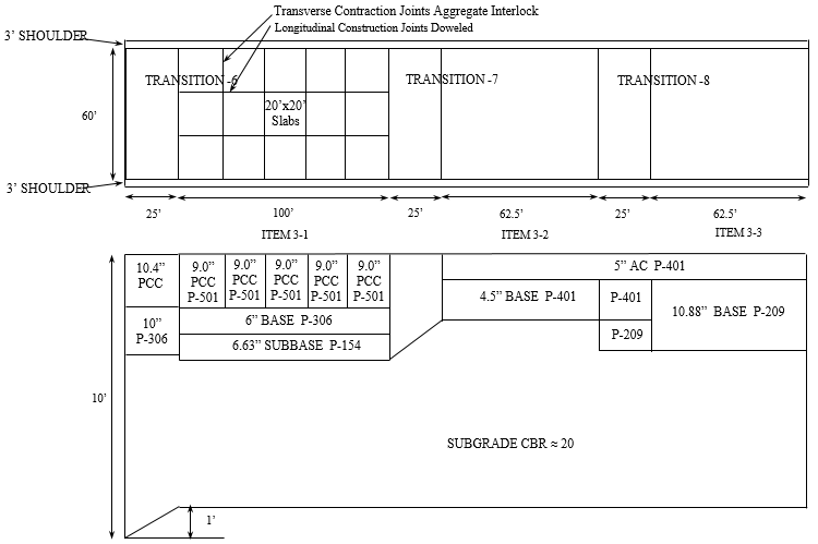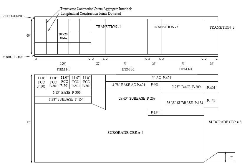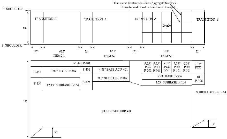 Since it was decided to plan the facility with three subgrade strengths, the overall length of the facility was set to the total length of each test item plus a transition area between test items and the length required for run up of the test vehicle and the ramp for construction and support vehicle access. Minimum test item lengths of 60 ft. (18 m) and 100 ft. (30 m) were established for flexible pavements and rigid pavements respectively. The transition length of 25 ft. (8 m) was selected. Therefore, the length of the CC1 experiment added up to 300 ft. (92 m) (McQueen 2000)