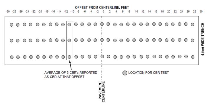 The CBR tests were performed at 2 ft. (0.6 m) intervals along the length of the trench with three penetrations for each CBR test as shown in the figure below. The minimum spacing of 12 inches (30 cm) between the adjacent penetrations was used. Moisture content was measured from the middle penetration of the CBR test samples.