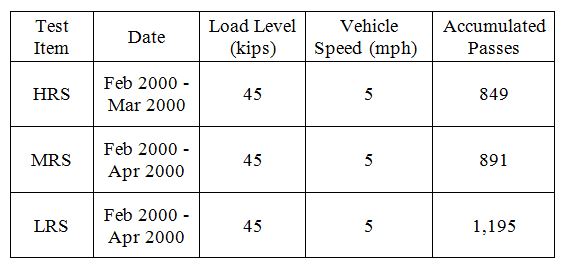 The test item, dates, wheel loads, and loading passing for each stage of trafficking are summarized in the table below. Trafficking was performed at 5 mph (8 km/h). Wheel loads were set at 45,000 lbs. (20.4 tonnes) with a target tire pressure of 188 psi (1296 kPa).