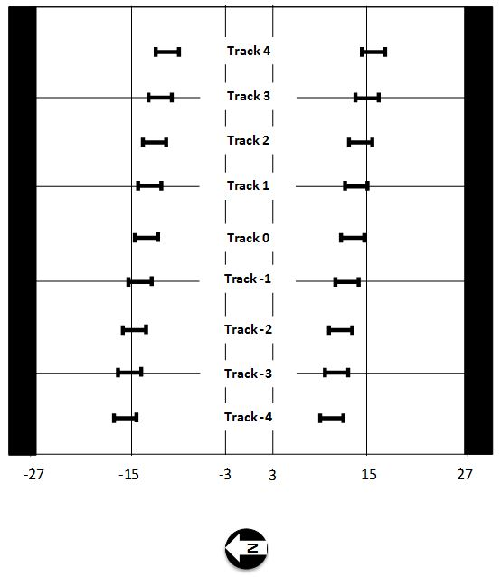 The 66 passes were arranged in 9 wander positions. Offsets from the centerline are provided in feet. The offset dimensions refer to the distance to the center of the load module, which is midway between the tires. The figure below should be used in reference to the track numbers given in the database.
