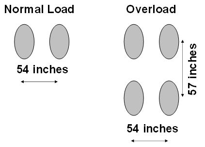For the Phase 2 Overlay Test a two gear configurations were used, a triple dual tandem (3D) and twin dual tandem (2D). The dimensions of the load configuration are illustrated in the figure below. The triple dual spacing was 54 inches and the twin dual tandem spacing was 54 inches.
