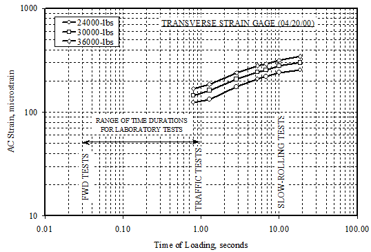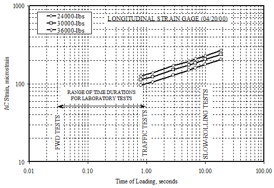 A series of additional traffic tests on high-strength subgrade test items were conducted in April 2000.  The purpose of these additional tests was to gain data on the effect of vehicle speed on HMA layers.  Tests were conducted at speeds of 0.25, 0.5, 0.75, 1.0, 2.0, 5.0, and 7.33 ft. /sec (0.08, 0.15, 0.23, 0.3, 0.6, 1.5, and 2.2 m/sec) and wheel loads of 24,000, 30,000, and 36,000 lbs. (106.8, 133.5, and 160.2 kN) at each speed.  To investigate the effects of vehicle speeds, peak HMA strains in test item HFS were measured at various speeds.