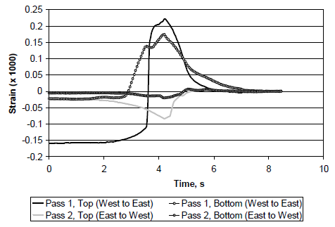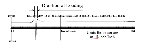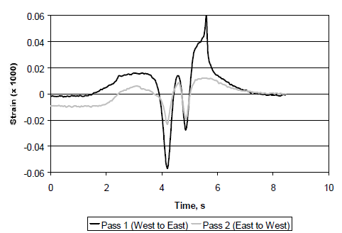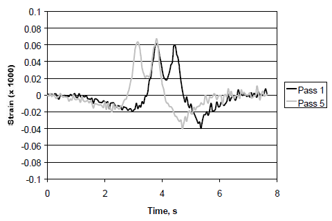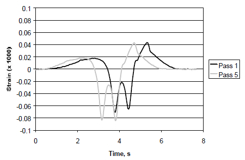 The figures below shows a typical response signal from a transverse ASG subjected to a dual-wheel load and 6-wheel loading configuration. Positive strain readings gradually diminished to an asymptotic value as the load moved away from the gauge. Multiple axle loads resulted in higher residual transverse strain than single axle loads.