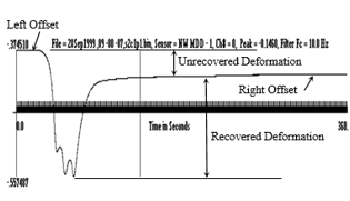 In some cases, the time history was such that the total response was equal to the unrecovered response.  The net unrecovered strain over a single wander cycle represents the incremental contributions to the permanent deformation accumulated over that wander cycle. When accumulated over the complete test to failure, these small increments of permanent deformation represent the total rut accumulation. The recovered displacement corresponds to the difference between peak and unloaded displacement. Recovered responses provide a good measure of the elastic behavior of pavement materials.