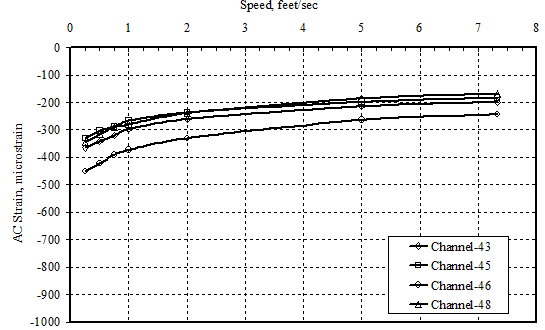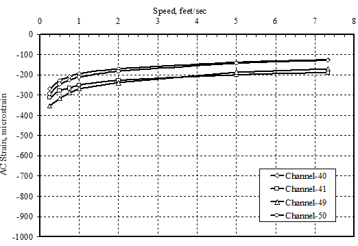 The figures below show the peak AC strains measured for test item HFS from longitudinal and transverse ASGs, respectively.  The difference in gauge measurements could be due to the position of gauge with respect to the wheel.  However as it can be seen from the figures, in all the gauges higher speeds (lower load durations) result in lower strains.  The rate at which measured strain reduces with speed, is higher at vehicle speeds lower than 2 feet/sec (0.6 m/sec).