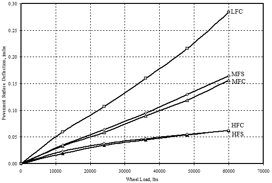 The figure below shows the recovered subgrade deflections for the flexible test items except LFS at different load levels. Test item LFC showed the highest subgrade deflection. The difference in subgrade deflections between test items MFC and MFS became more with increasing load levels. Test items HFS and HFC showed almost similar subgrade deflections.