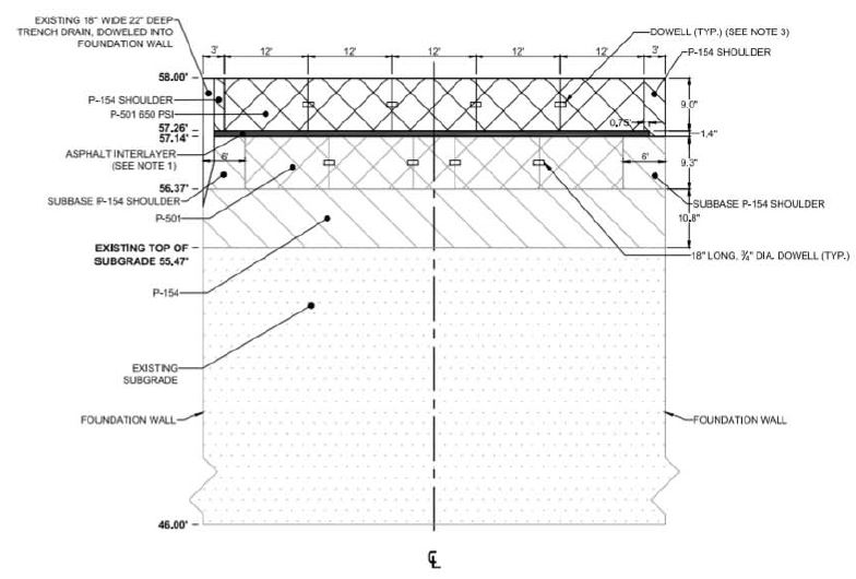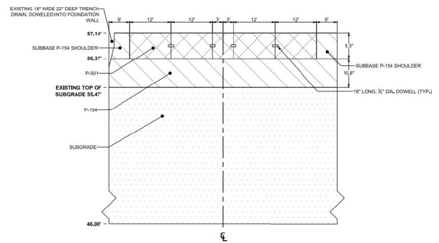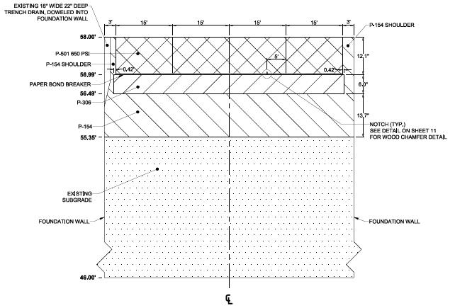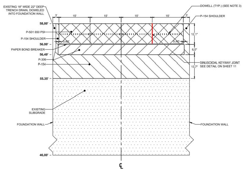 The width of the section ran from -33 ft. (north side) to +33 ft. (south side), which included 6 ft. of existing subbase shoulders on both sides. For the P-501MR layer, longitudinal joints were placed such that the pattern across the remaining 54 ft. width produced ten 12 ft. by 12 ft. slabs each on the north and south sides of the test area, with the middle 6 ft. slabs being utilized as transitions.