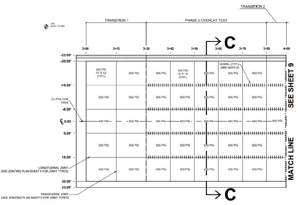 The design thicknesses for the Overload section were P-154M = 13 in., P-306MR = 6 in., and P 501MR = 12 in. The Joint Comparison Test design was constructed between STA 4+00 and 4+90 and was flanked between Transition 2 (STA 3+90 to 4+00) and Transition 3 (STA 4+90 to 5+00).