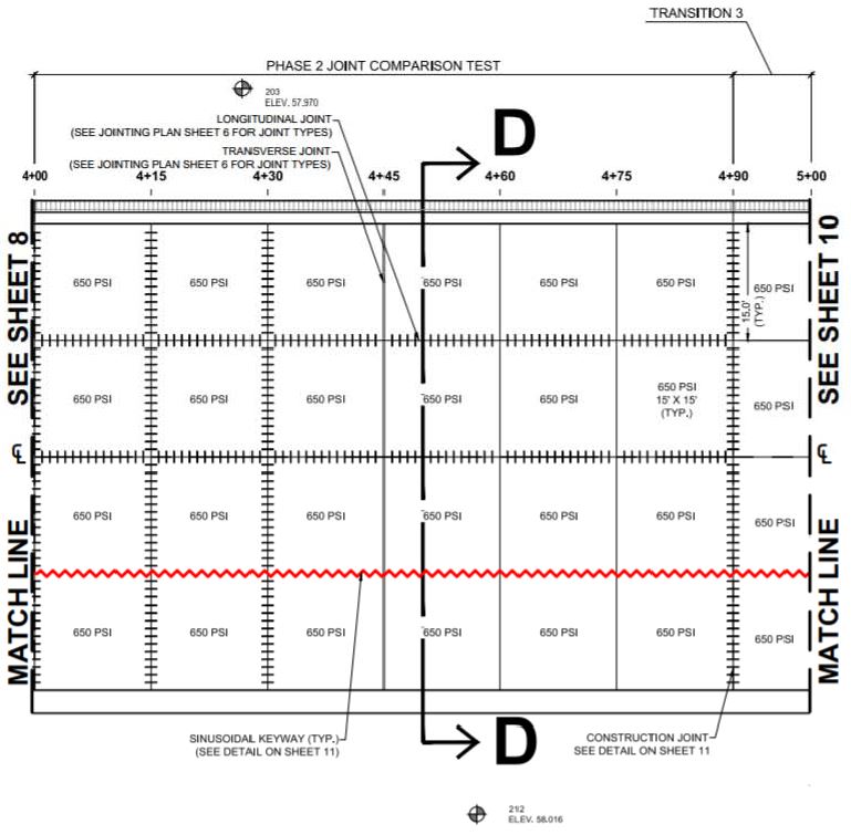 Longitudinal joints were construction joint Type E Doweled using 1 in. diameter dowels at an offset of -15 ft. (north side) and along the centerline. Longitudinal joints at an offset of +15 ft. (south side) were constructed using a construction sinusoidal keyway joint.