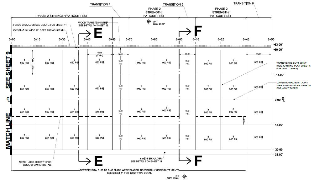 All transverse and longitudinal joints were constructed using construction Type F Butt Joints and compression seals. The figures below shows the as-built plan and profile drawings for the Strength and Fatigue test design (Note: due to construction variance, as-built elevations may differ from the design).