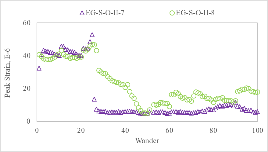 The typical response of the ECS was monitored during the first ten wanders of the traffic test. As anticipated, the critical deflection response in the ECSs was observed when the outer wheel in either carriage passed directly over the sensor.