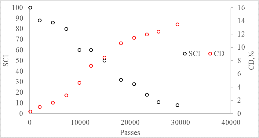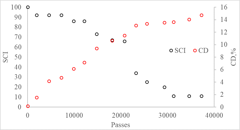 In addition to SCI, the crack density parameter (CD) was used to quantify the performance of concrete overlay (2, 3). An apparent decrease in the rate of change in CD occurred after approximately 23,000 vehicle passes. A side-by-side comparison between the changes in SCI and CD is given in the figure below. As anticipated, the CD increases with decreasing SCI.