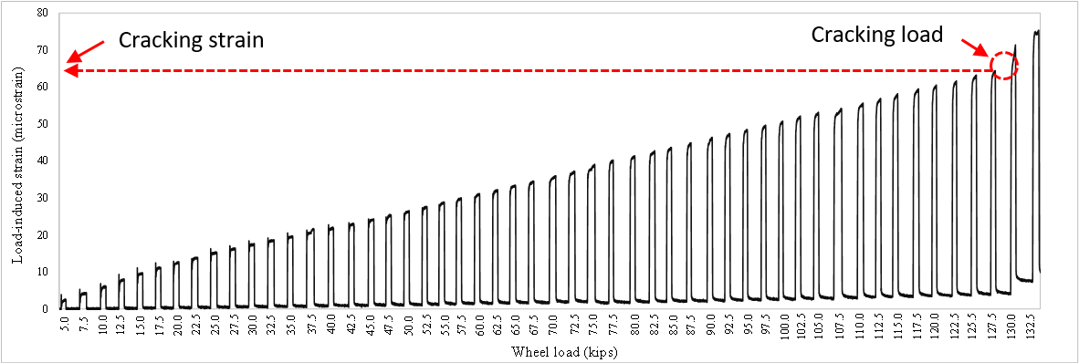 During the static load tests, strain gage data on crack initiation were collected over a two-day period, August 21-22, 2018. The data below were obtained in a static load test to initiate a bottom-up crack in slab SF9N, north outer lane. The NAPTV single-wheel module was positioned as described and illustrated in the Wander Pattern/Static Load section here. The initial wheel load of 5,000 lbs was applied, held for approximately 10s, and then released. The wheel load was then increased in 2,500 lbs increments and the procedure repeated until EG-N-SF-II-10 response indicated a rupture at the slab bottom. As shown in the figure, the relationship between recorded strain and applied load was approximately linear at low load levels but turned highly nonlinear after a crack formed at 130,000 lbs. The table below summarizes cracking loads and associated strains from the static load tests.