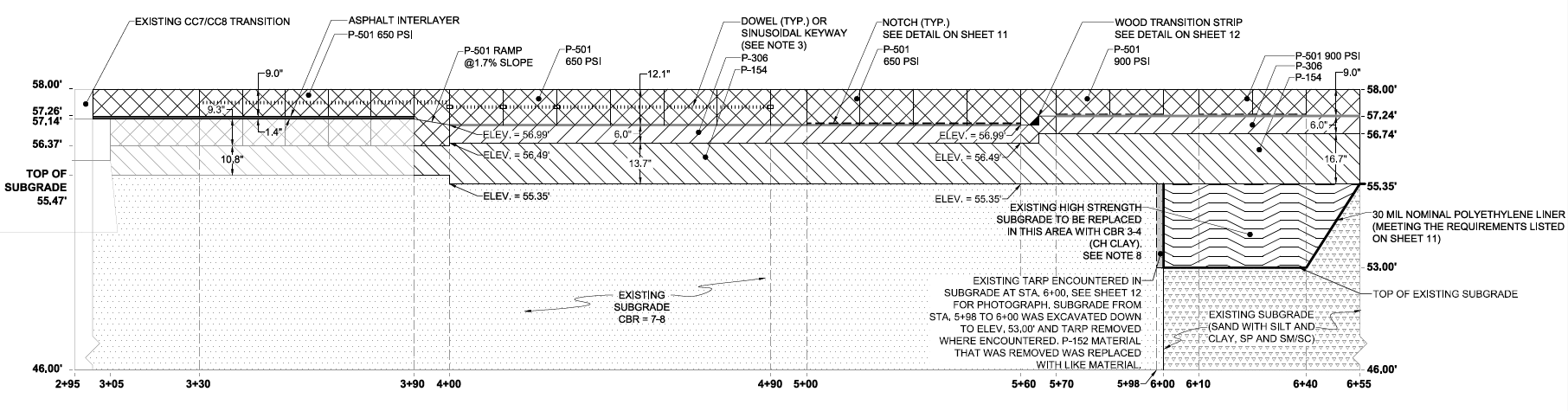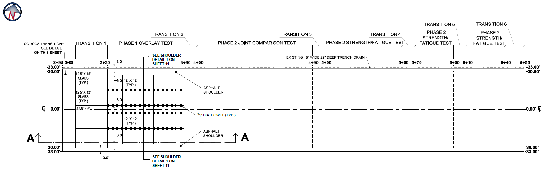 CC8 Phase 4 Strength & Fatigue Test occupied the area between STA 5+00 and STA 6+55. Three sections were constructed with varying strengths and thickness: