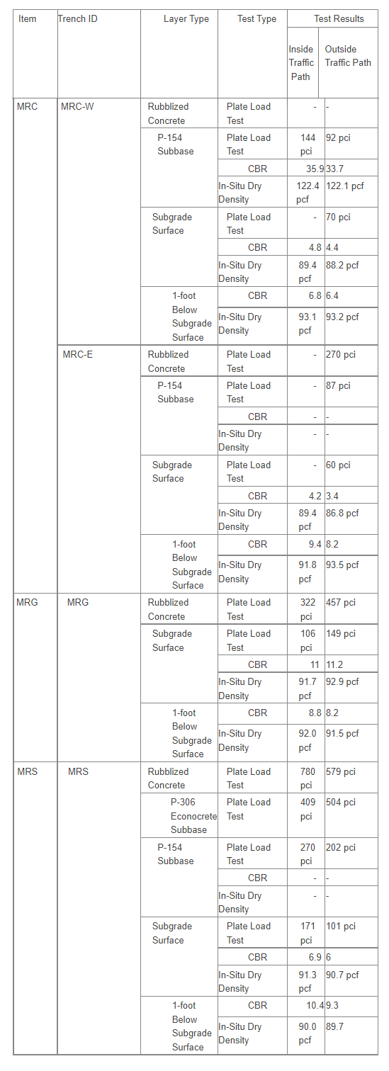 According to EB-66, “Rubblized pavements modulus have been found to vary from a low of 30 ksi to over 300 ksi depending on the original pavement thickness, base type and condition of base layers. When strength parameters are unknown, it is a fair assumption that most rubblized material will perform equal to or better than FAA standard Item P-209. Unless additional project specific information is available, a one-to-one substitution should be used in the design procedures provided that sufficient subgrade conditions exist to allow proper rubblization.” Approximately the same range of backcalculated modulus values were measured during trafficking of the three test items, although significantly higher values were measured in MRC and MRG before trafficking. The value of approximately 300,000 psi measured in MRS before trafficking was at the top end of the EB-66 range.
