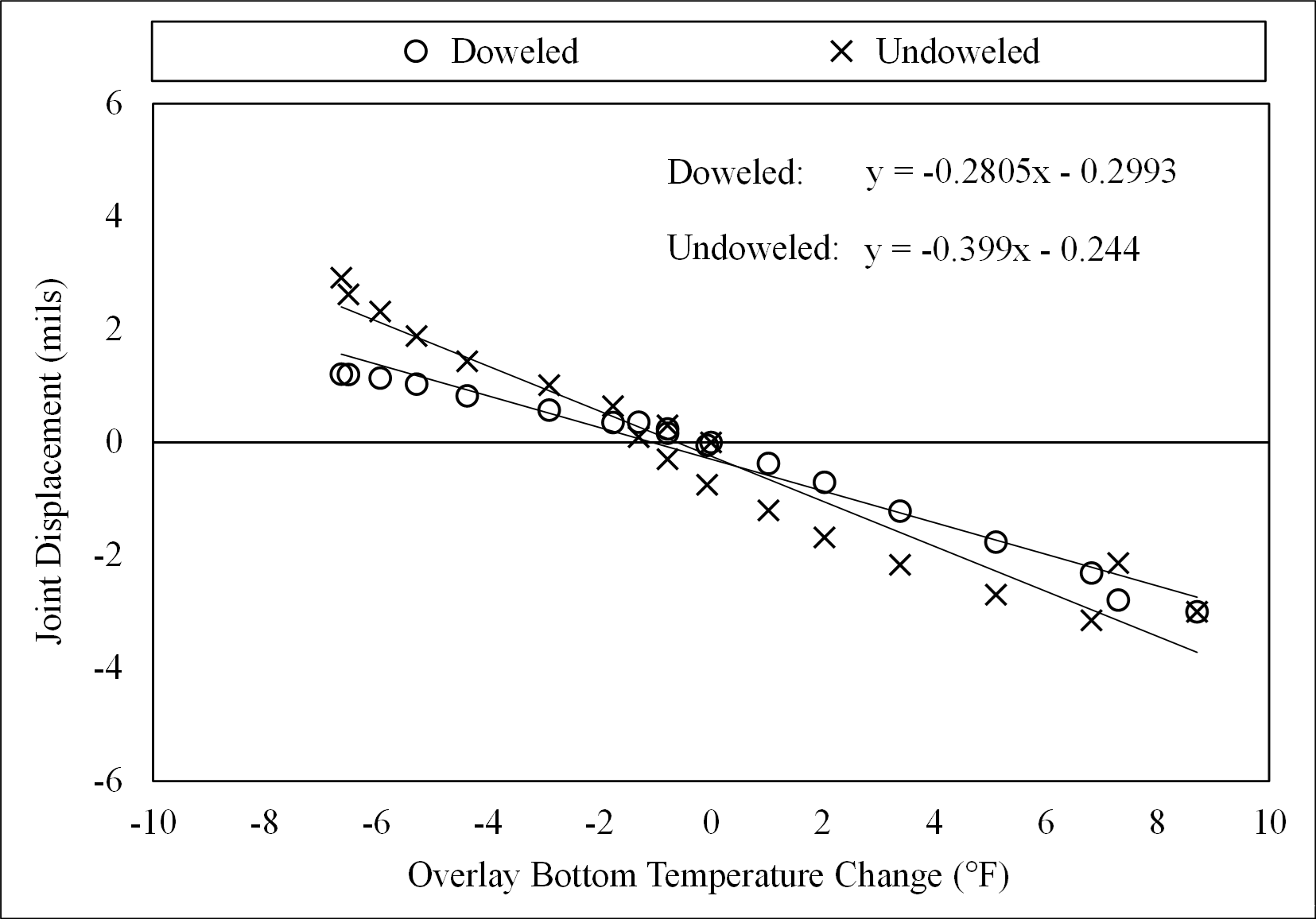 An effort was made to correlate pavement temperature and joint opening/closing. During trafficking, the temperature variation in concrete (P-501MR), as captured by the thermocouple embedded at the mid-depth of PCC slabs, was very small (< 4°F). On the other hand, the range of temperatures in asphalt (P-401MR) layer was larger (> 15°F) due to the exposed overlay edges and the differential of thermal coefficient of contraction and expansion (CTC/E). Figure 16 plots the joint displacement against the temperature change at the bottom of the overlay for both doweled (TO12) and undoweled (TO23) joints. In linear fashion, the PCC joint opened whenever the overlay temperature decreased and vice versa. Regardless of the joint type, the joint opening/closing was governed by both the slab contraction/expansion and the resistance from the overlay material. Thus, the bottom of the overlay underwent temperature-induced tensile stress cycles.