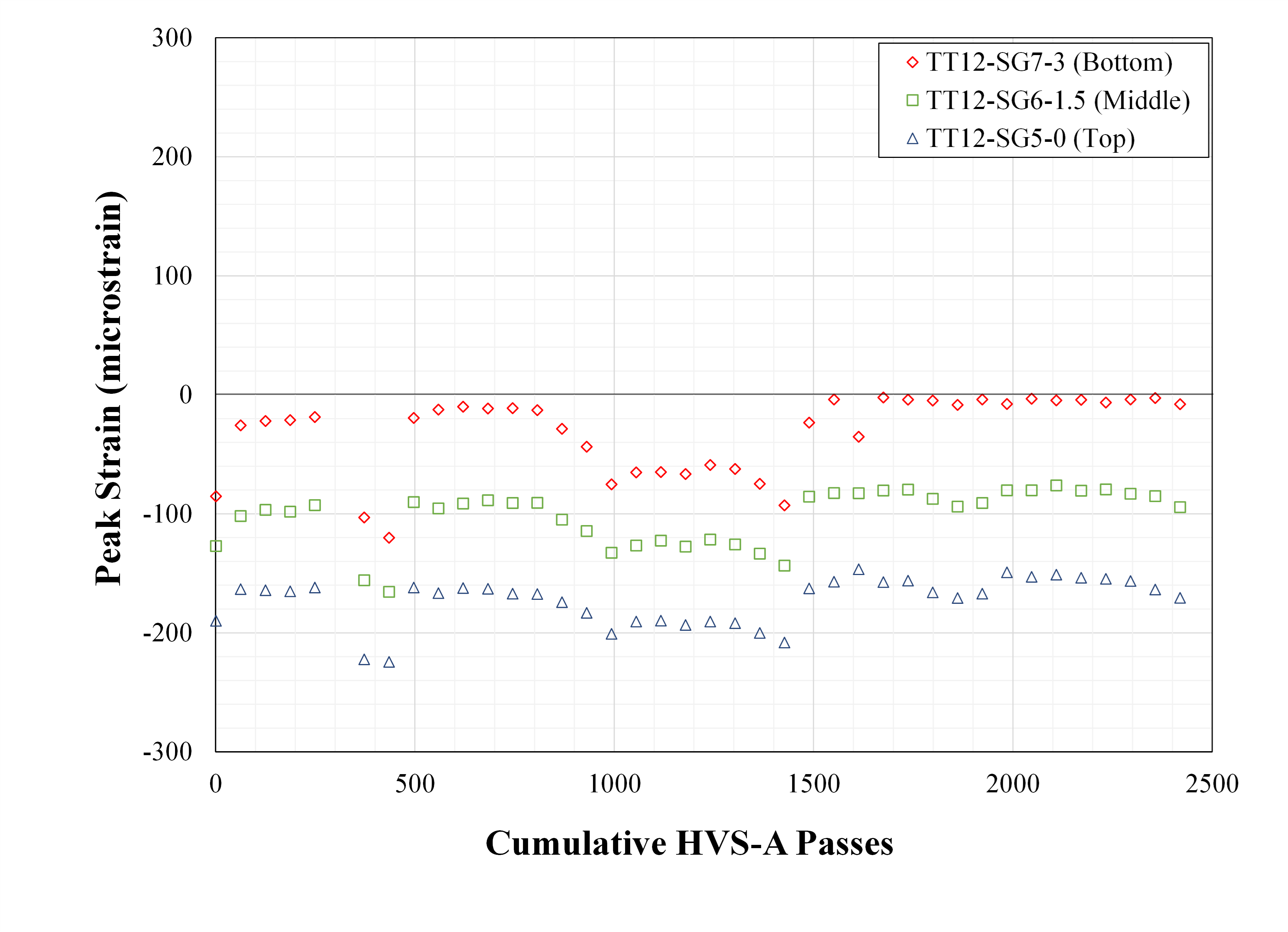 Surface strain responses converged during the HVS-A trafficking period in undoweled joints (TT23, TT34, and TT45). For example, along West edge TT23, the top, middle, and bottom surface strain gauge response values start at values of 65.5, -73.7, and -170.9 microstrain, respectively. Whereas, at the conclusion of trafficking (HVS-A Cumulative Pass Number 2419), the top, middle, and bottom surface strain gauge response values start at values of 22.5, -21.5, and -41.2 microstrain, respectively. Surface strain responses remained consistent during the HVS-A trafficking period in doweled joints (TT12 and TT56).