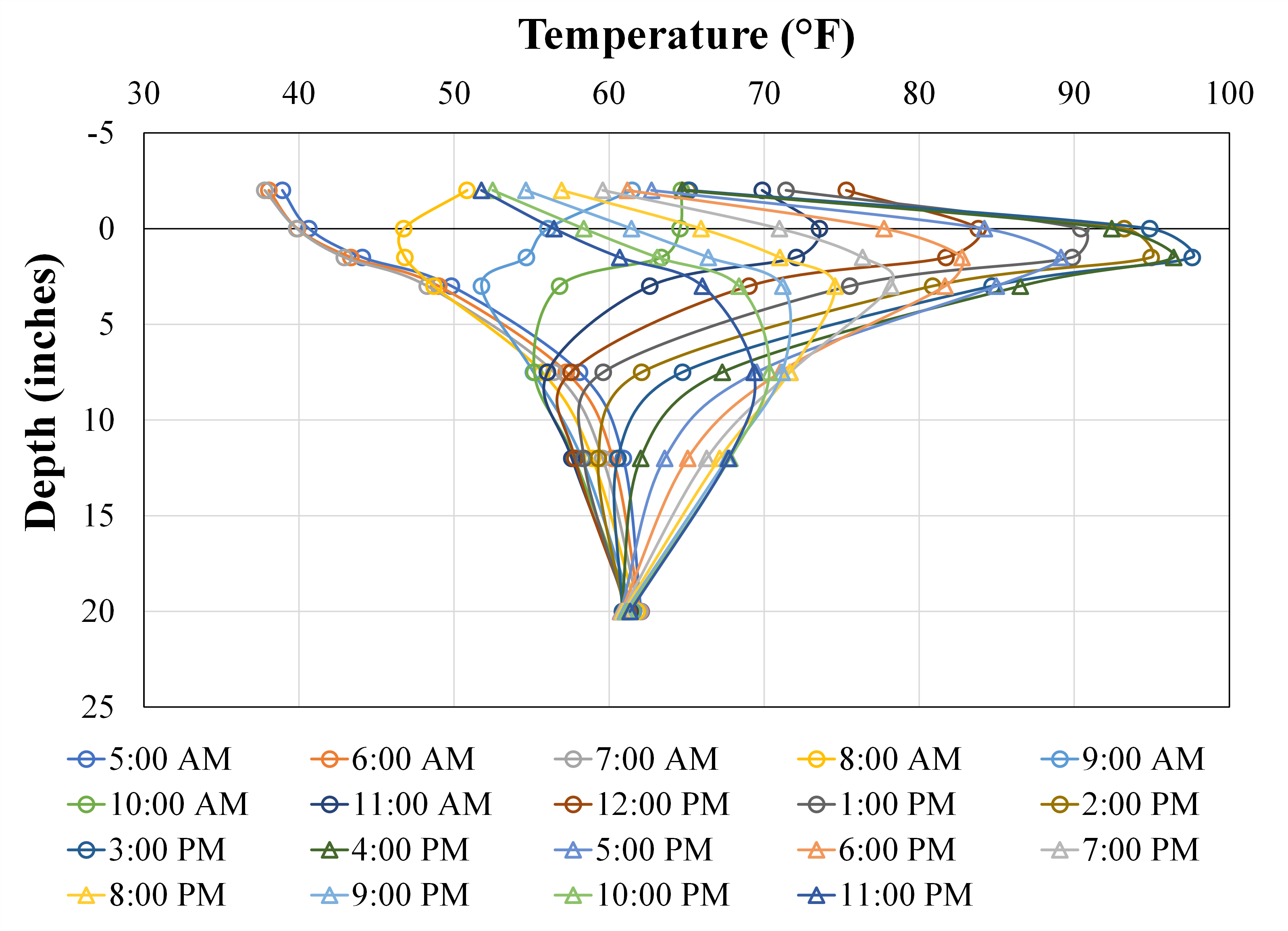 Peak ambient temperature recorded was 75.3°F at 12:00 PM. The lowest ambient temperature was recorded at 7:00 AM with an ambient temperature of 37.8°F. The peak temperature recorded in the HMA overlay was 97.6°F (located at the mid-depth, 1.5 inches of the HMA overlay). The lowest temperature recorded in the HMA overlay was 39.8°F (located at the surface of the HMA overlay). At greater pavement depths, the temperature converged to approximately 61°F.